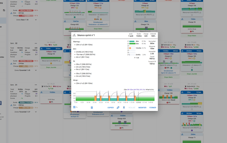 Grâce à une plateforme d’entraînement dédiée, tu bénéficies de tests pour calibrer tes zones, de l’envoi automatique des séances sur ton compteur (Garmin, Wahoo, Bryton). Chaque séance peut inclure également des conseils nutritionnels pour optimiser tes performances et ta récupération.